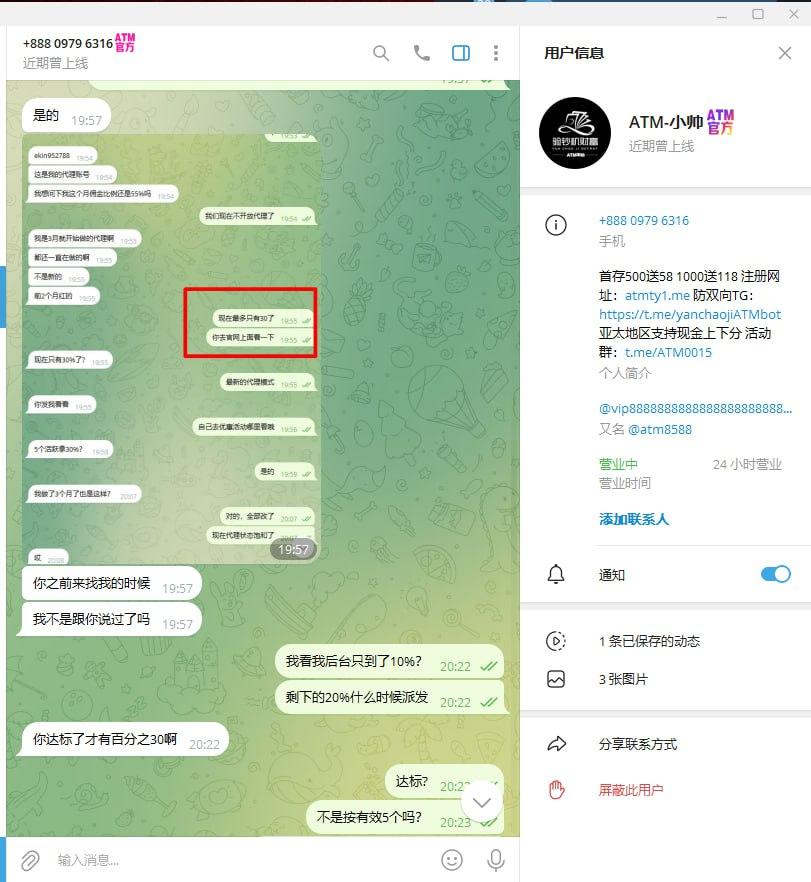 我是3月就在ATM做的代理,当时都是谈好的55%返佣,直到7月中旬后说变动了,当时咨询问了说是5个活跃30%,现在开始玩文字游戏了,30%的返佣还要配合你代理的净输赢达到30W+的情况下才能领取,试问这不就成了3%的返佣政策了吗?3%的返佣模式有代理会去推广吗,一个给你推广平台带来输赢的代理还比不上你们一个员工拿的返点多,实在是高招,不知道是不是平台杀一波要跑路了 ,现在我已经把会员都转移了,希望各位代理玩家避雷。