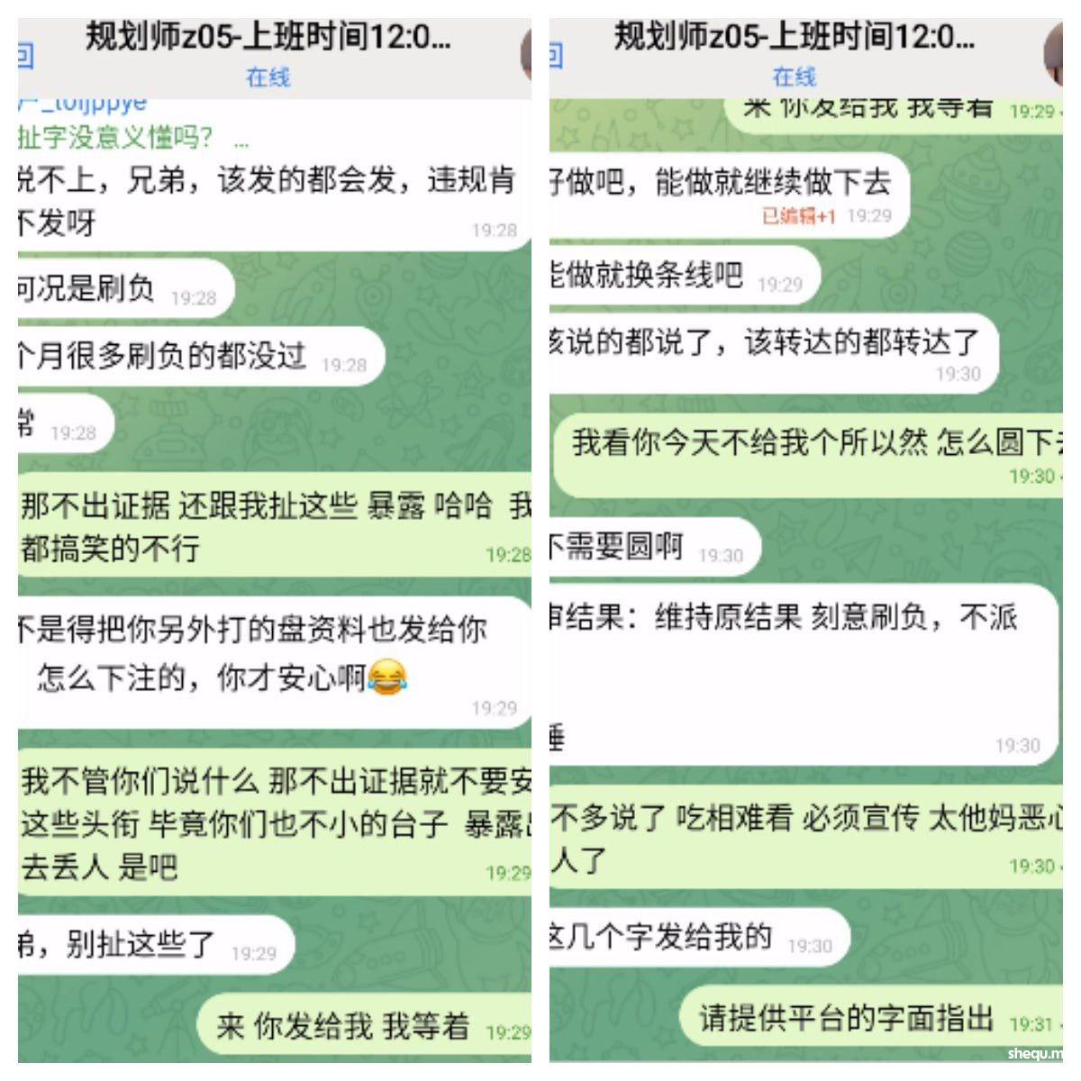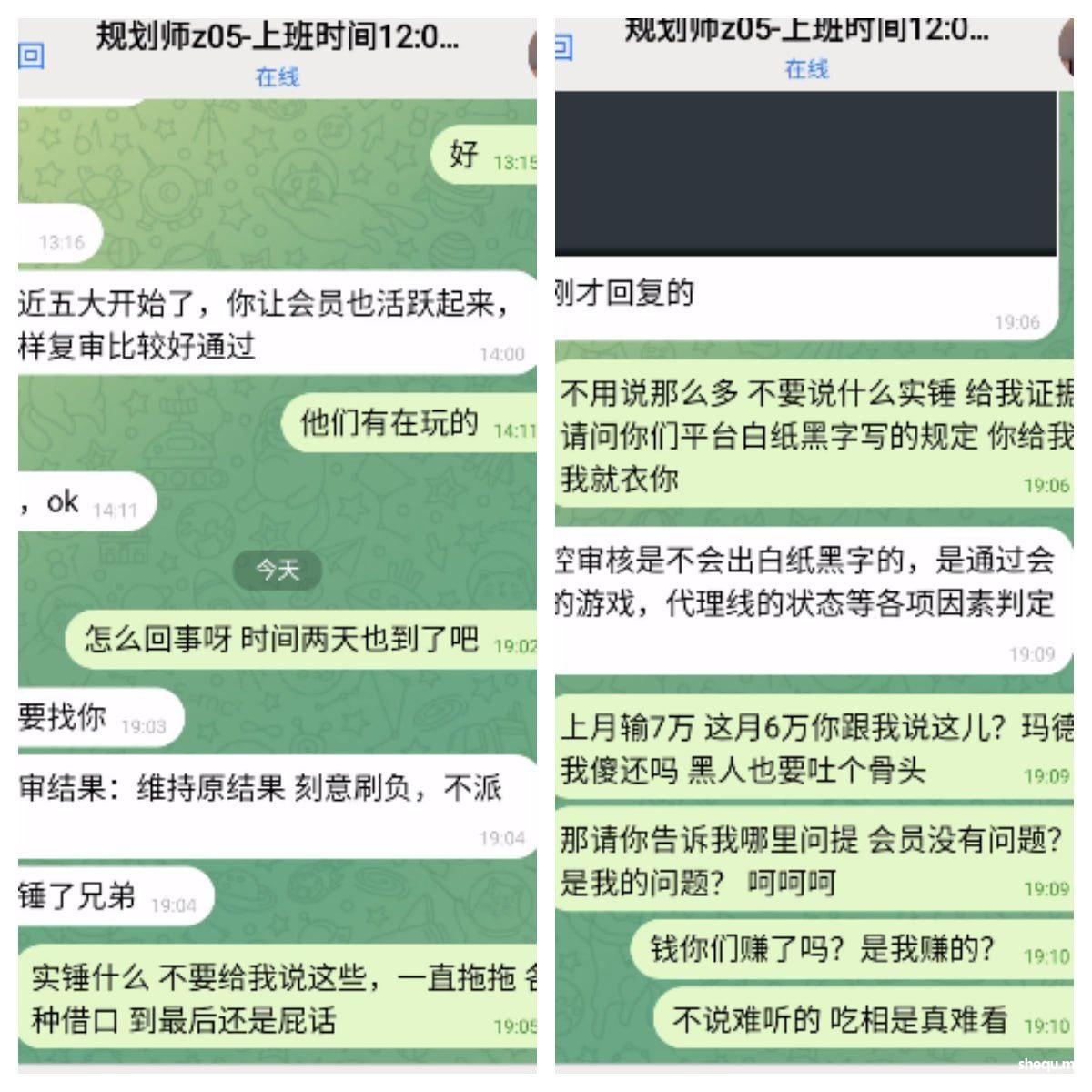 问他什么原因,说不出来,首先开始给你说让你提供会员发展证明,那么好我上传给他们聊天沟通截图,然后给你说让你提供录屏,好我录屏也提供了就让你等,一直拖到月中了我去问,又忽悠你说这才月中佣金还没有结束,上报老板在审核了,然后给你说5大联赛开始了让我继续维持会员保持活跃,这样好通过,好我也一直在维持会员,会员也一直在玩,8月又输了5W多负盈利,最后到现在我看他是实在圆不下去了