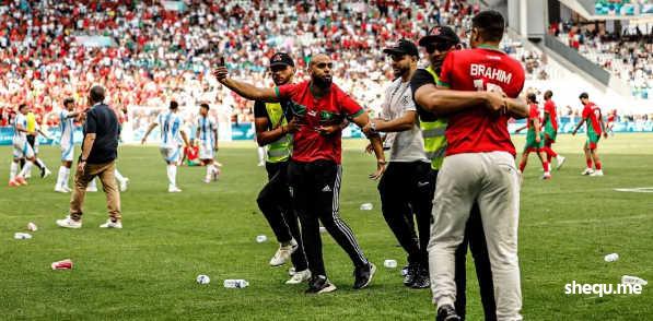 进球回放还没放完,主裁判就吹响了终场哨。阿根廷队的绝平进球,让摩洛哥球迷心态失衡,他们疯狂将各种物品扔进场内,甚至还有人冲进球场,试图攻击阿根廷队的球员。裁判员不得不让两队球员返回更衣室,比赛变成了一场闹剧。