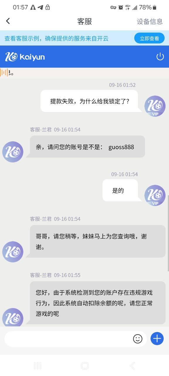 直接给我锁定,我再去找客服问是什么情况,客服说我投注违规,直接给我连本带利全部扣完了,我的玩法都是倍投的怎么可能违规,系的像你们这样杀人的。我的开云账号我也发出来了,23年的时候还是v9,有一段时间没玩了,现在也是v6,但是输的500万是实实在在的,这个开云你们心里清楚,但是狗日的开云好不容易赢个8万也他妈的黑,关键黑就算了他妈的本金也黑了,哪个博